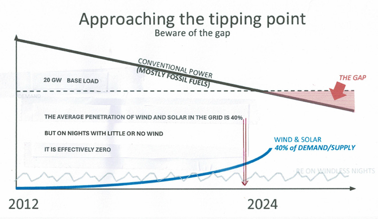 Ten coal stations closed in the NEM between 2012 and 2024, reducing the coal capacity from the vicinity of 29 GW to approach 20GW which is the base load required overnight. When the capacity of reliable power falls below the base load, the grid enters a red zone where RE input is required to keep the lights on, but none is available on windless nights, regardless of the number of windmills and solar panels installed.